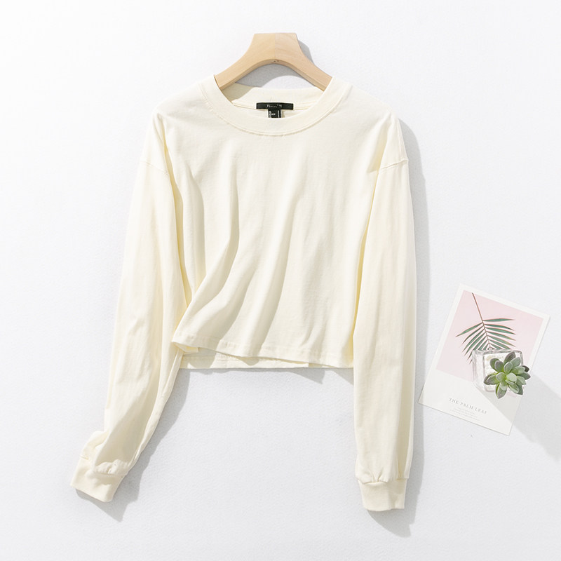 H21-3春秋女外贸宽松高腰短款T恤上衣纯色休闲时尚薄款棉长袖卫衣