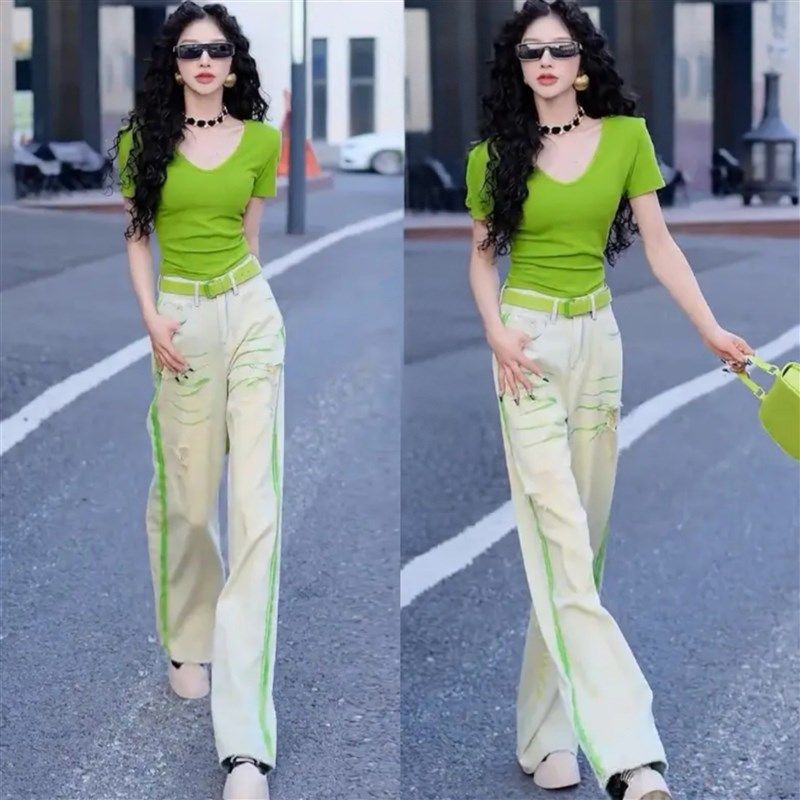 夏季气质高腰短款T恤显瘦时尚蓝色拼接绿色涂鸦破洞直筒女牛仔裤