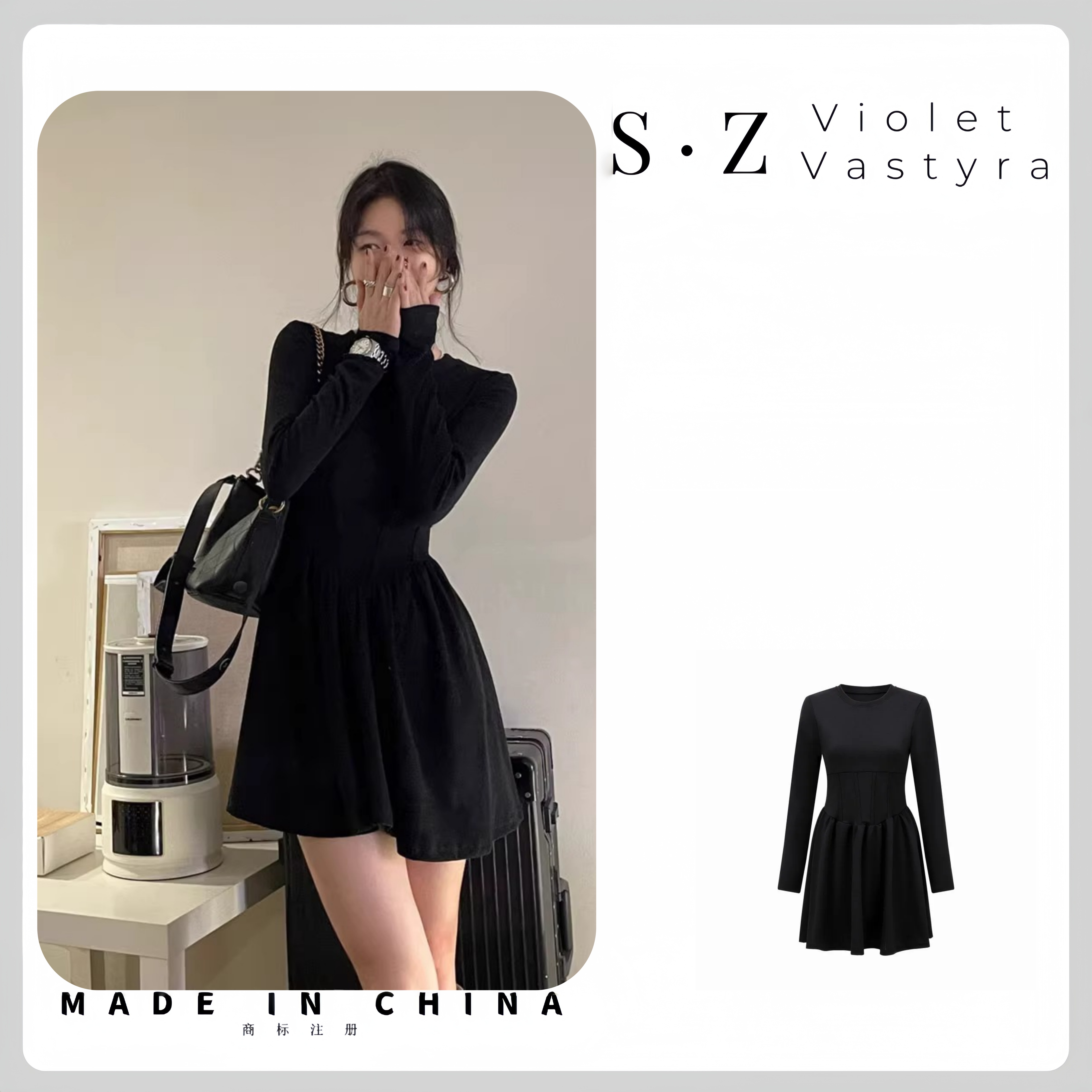 【●露露酱NN】赫本风设计感鱼骨小黑裙长袖蓬蓬连衣裙 CQQD004