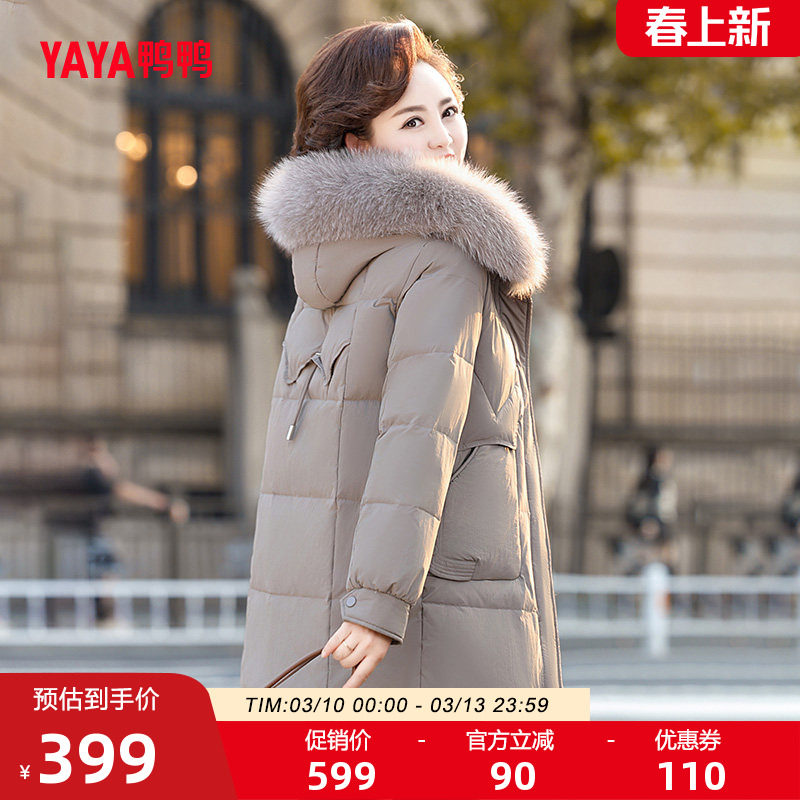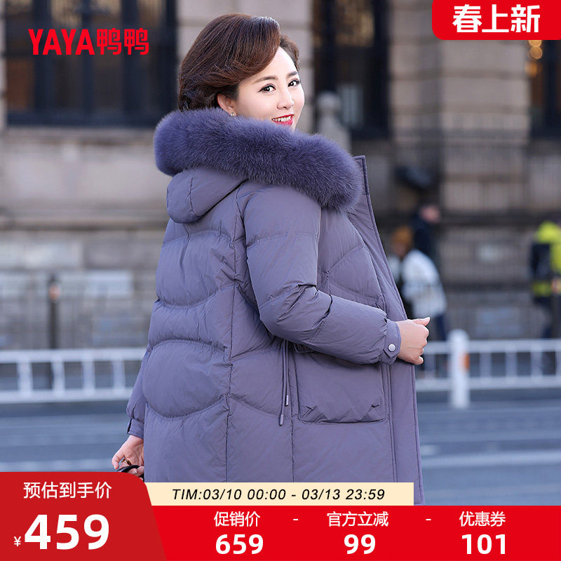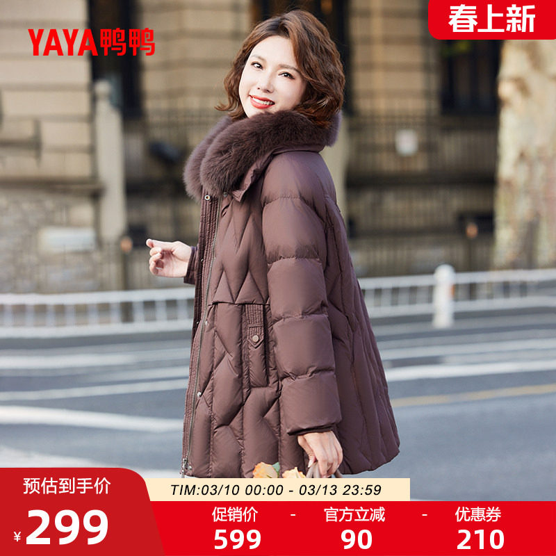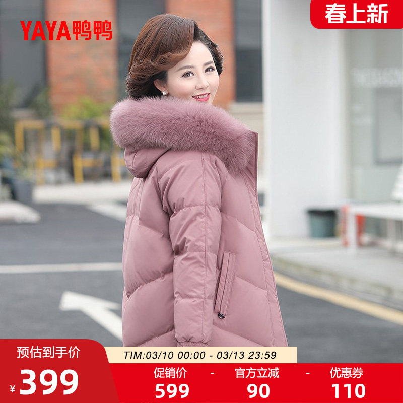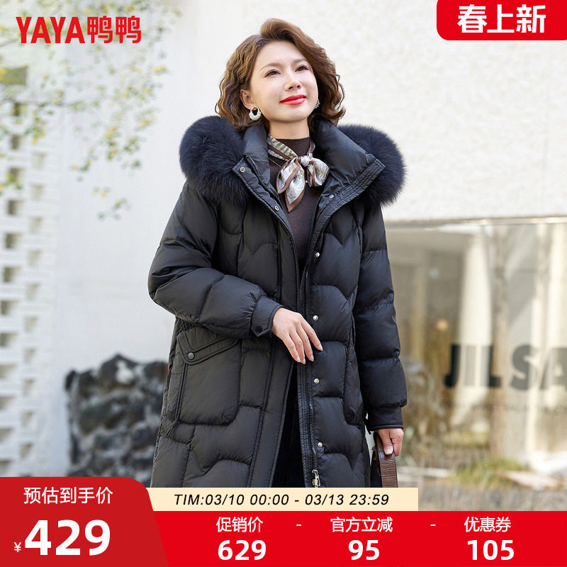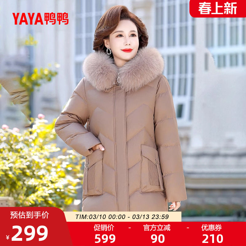 鸭鸭羽绒服女2025冬季新品连帽狐狸毛领中长款保暖妈妈中老年外套
