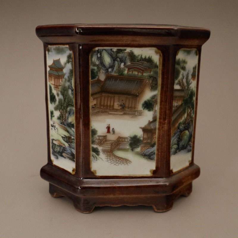 热卖复古清光绪粉彩山水纹笔筒家居装饰摆件古玩瓷器仿古做旧收藏