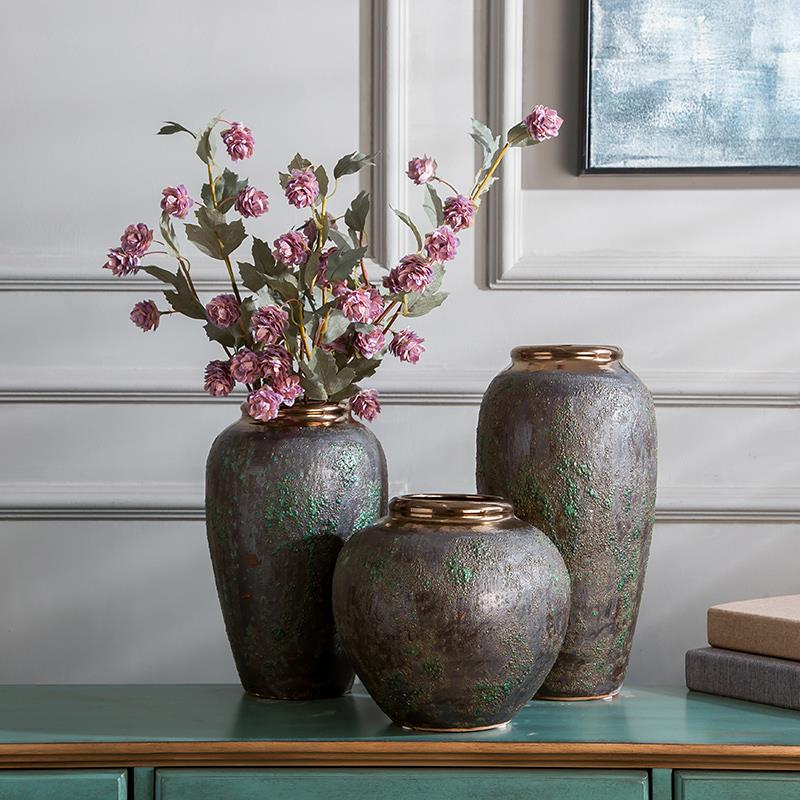 景德镇陶瓷器批发 复古落地花瓶仿古粗陶罐花器做旧绿釉花瓶摆件