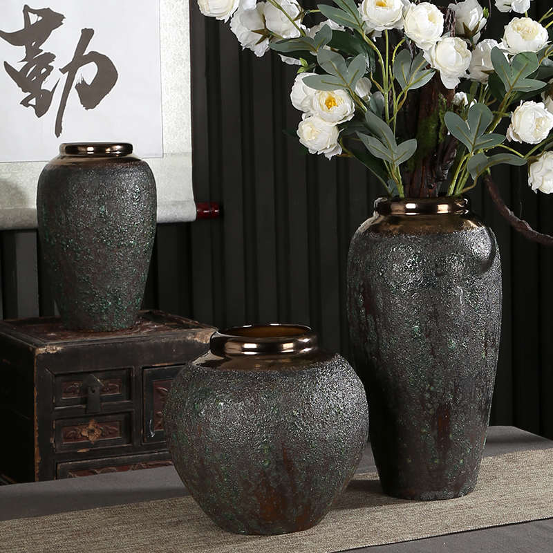 中式陶瓷花瓶粗陶做旧陶罐插花复古别墅禅意艺术瓷器仿古花器摆件