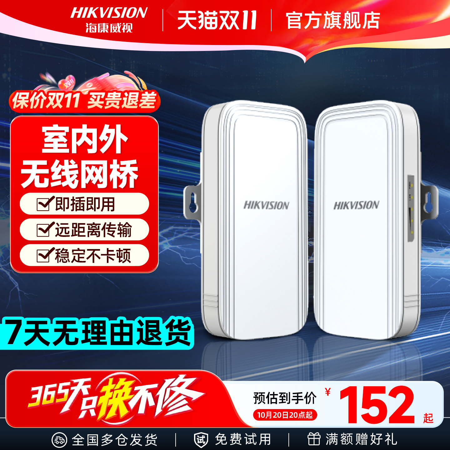 海康威视监控无线传输100米200米500米1公里3公里5公里中继器千兆电梯/室外户外1对多/点对点5.8G网桥poe供电