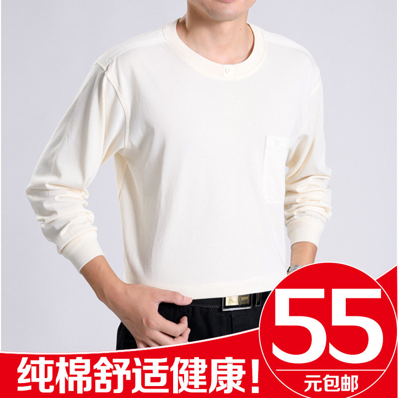 包邮秋季纯色长袖T恤男 中年男士圆领纯棉t恤加大码爸爸装带口袋