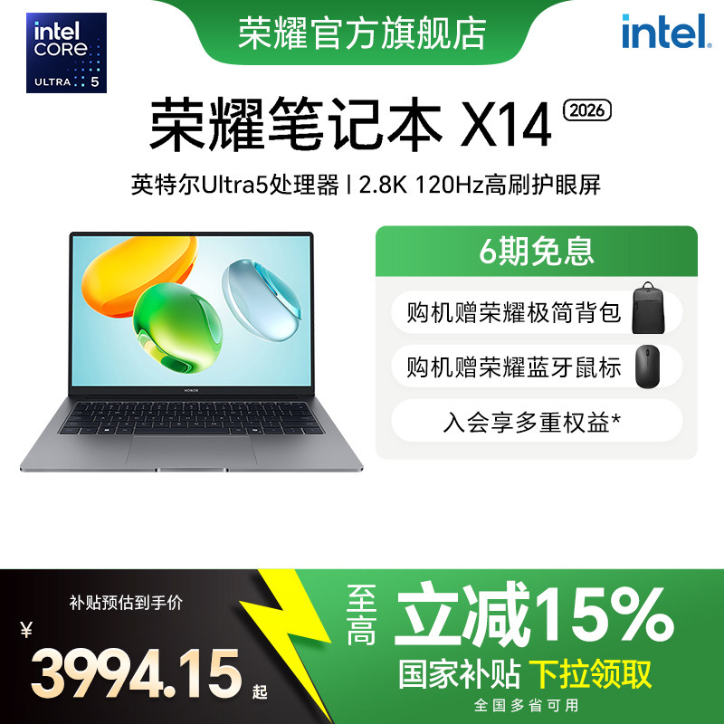 荣耀笔记本X14 2026 英特尔酷睿Ultra5 处理器120Hz 2.8K高刷护眼屏 14寸轻薄笔记本电脑