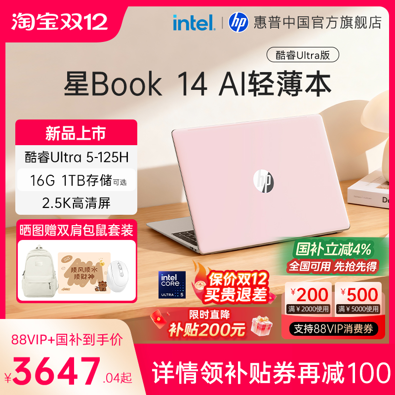【限时补贴+88VIP+4%国补】HP/惠普可选星Book14英特尔酷睿ultra5/7笔记本电脑轻薄便携学生AI办公官方旗舰店
