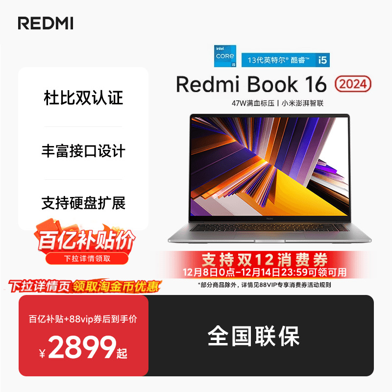 【百亿补贴+支持88VIP消费券】小米RedmiBook 16 2024英特尔酷睿标压轻薄商务笔记本办公商务电脑