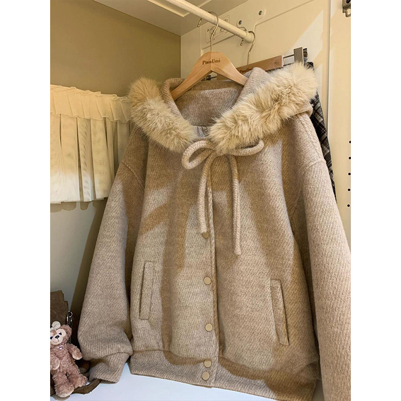 韩系蝴蝶结绑带大毛领连帽毛呢外套女秋冬季新款小众短款呢子大衣