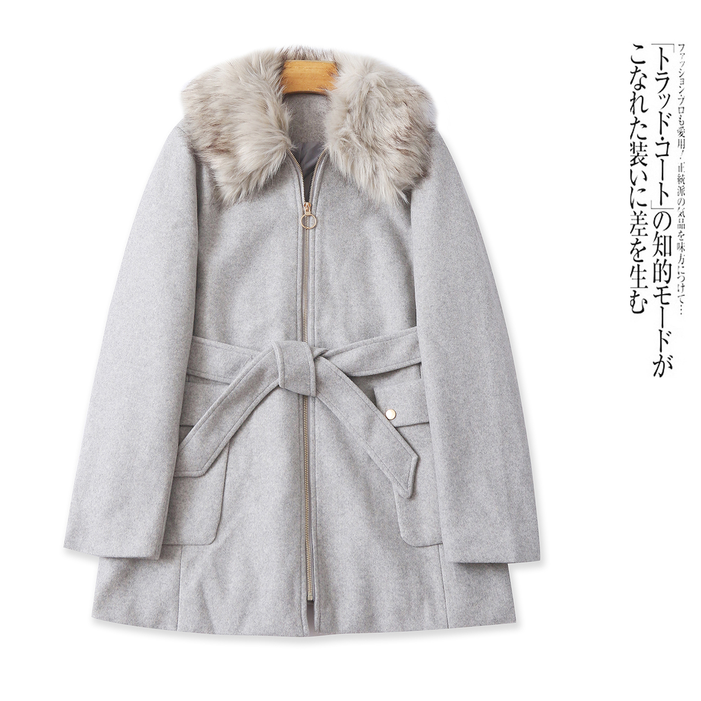 中长款毛呢大衣 秋冬新款外贸女装毛领拉链腰带配饰长袖外套32332
