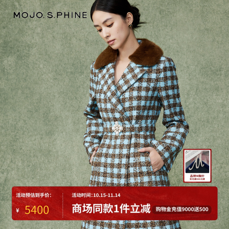 MOJO莫佐摩登格子长款大衣2024秋冬新款时尚带毛领气质毛呢外套女
