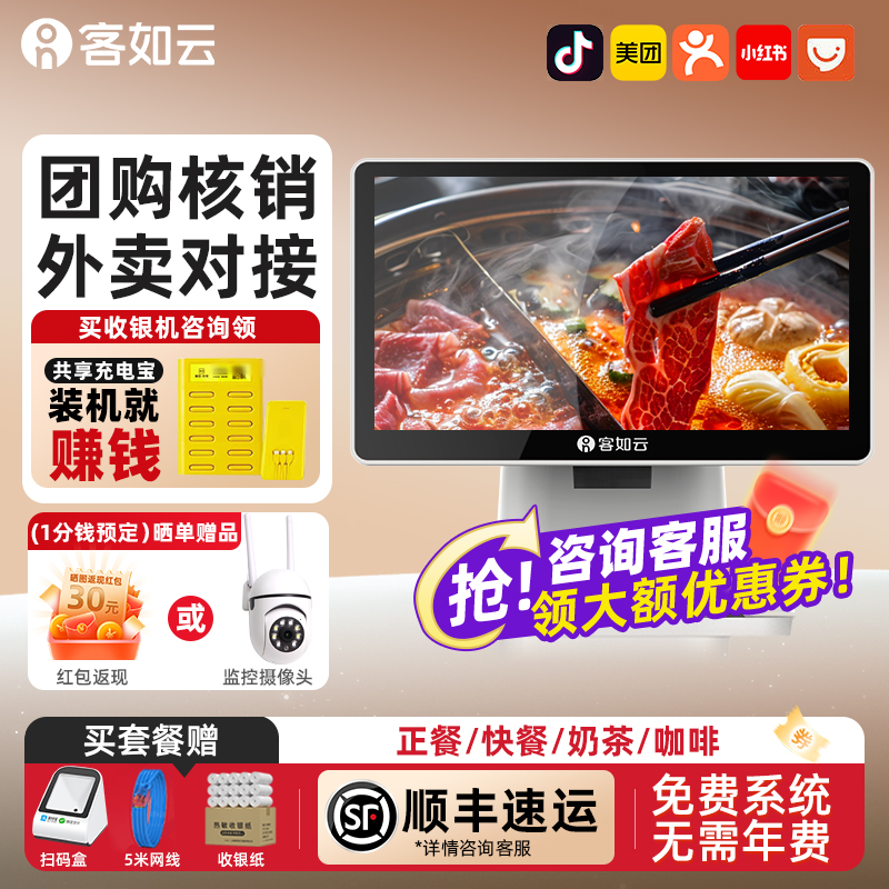 客如云收银一体机餐饮扫码点餐机零售超市水果店称重快餐美团外卖抖音团购美食城烧烤火锅店KDS厨显收银系统