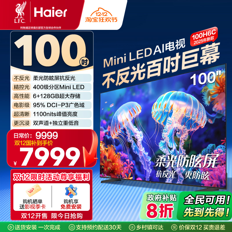 海尔电视100H6C 100英寸新款AI智能液晶电视机家用以旧换新补贴