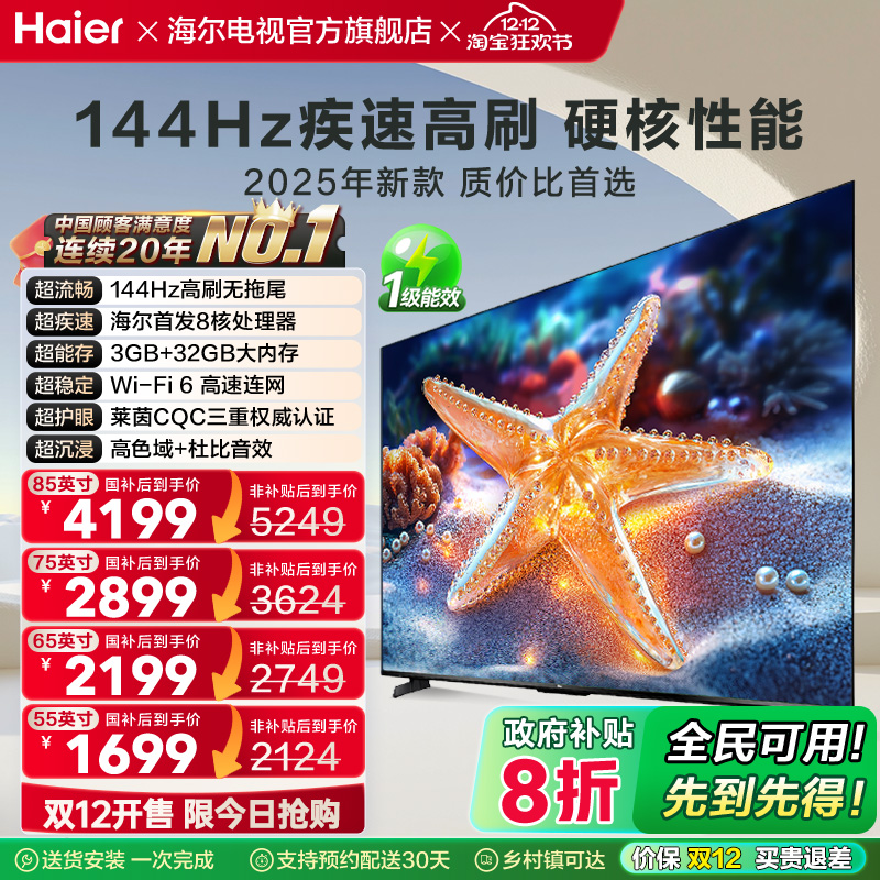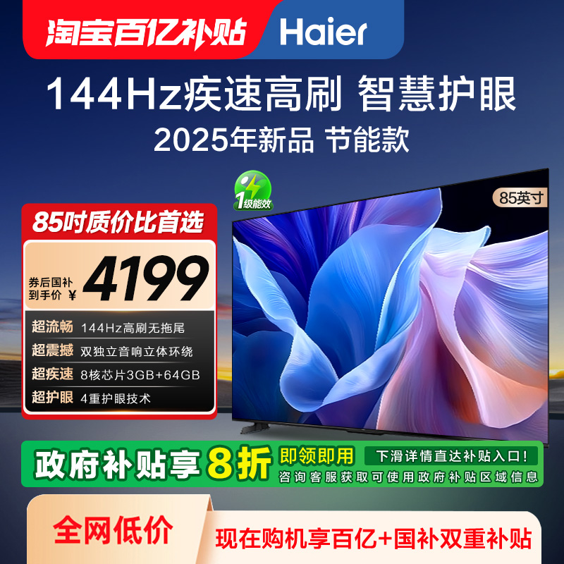 海尔85英寸一级能效电视2025新款高刷高清智能液晶电视机家用彩电