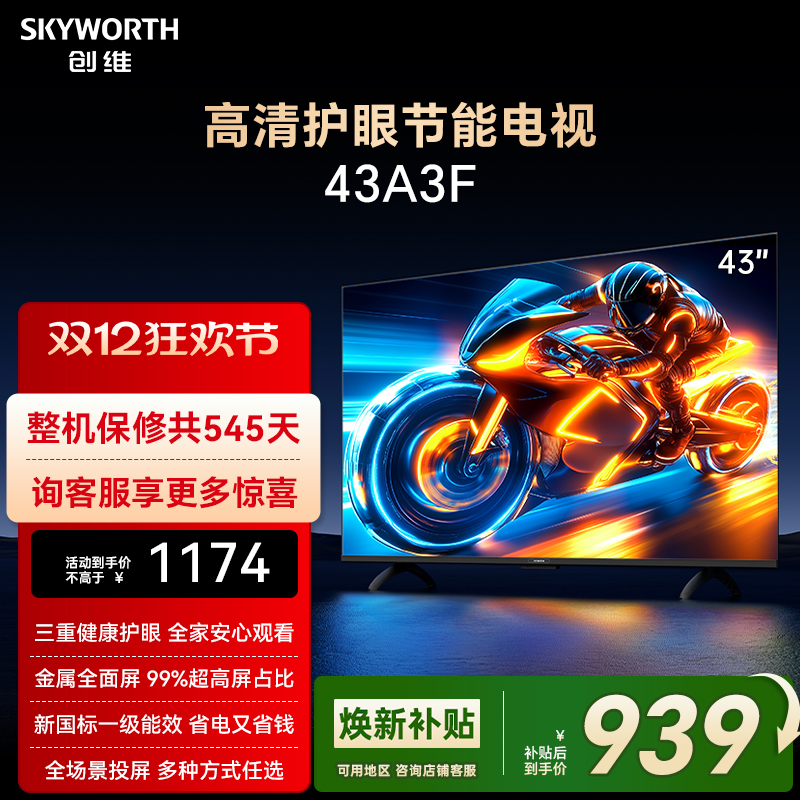 创维电视 43A3F 43英寸 护眼投屏智能液晶电视机 以旧换新补贴