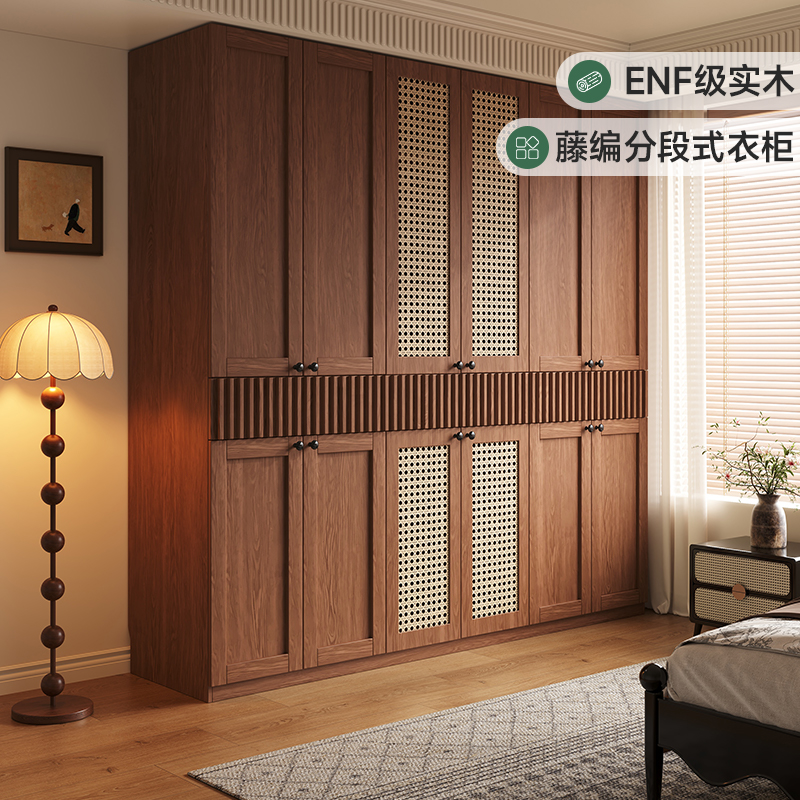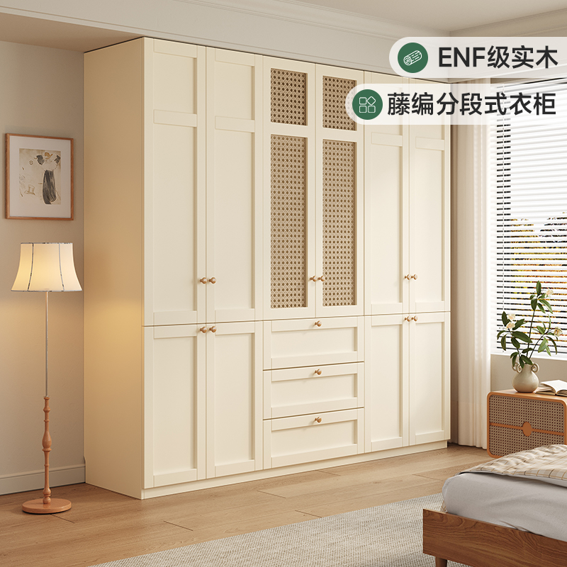 政府补贴定制实木橡木衣柜家用主卧藤编分段式奶油风储物收纳衣橱