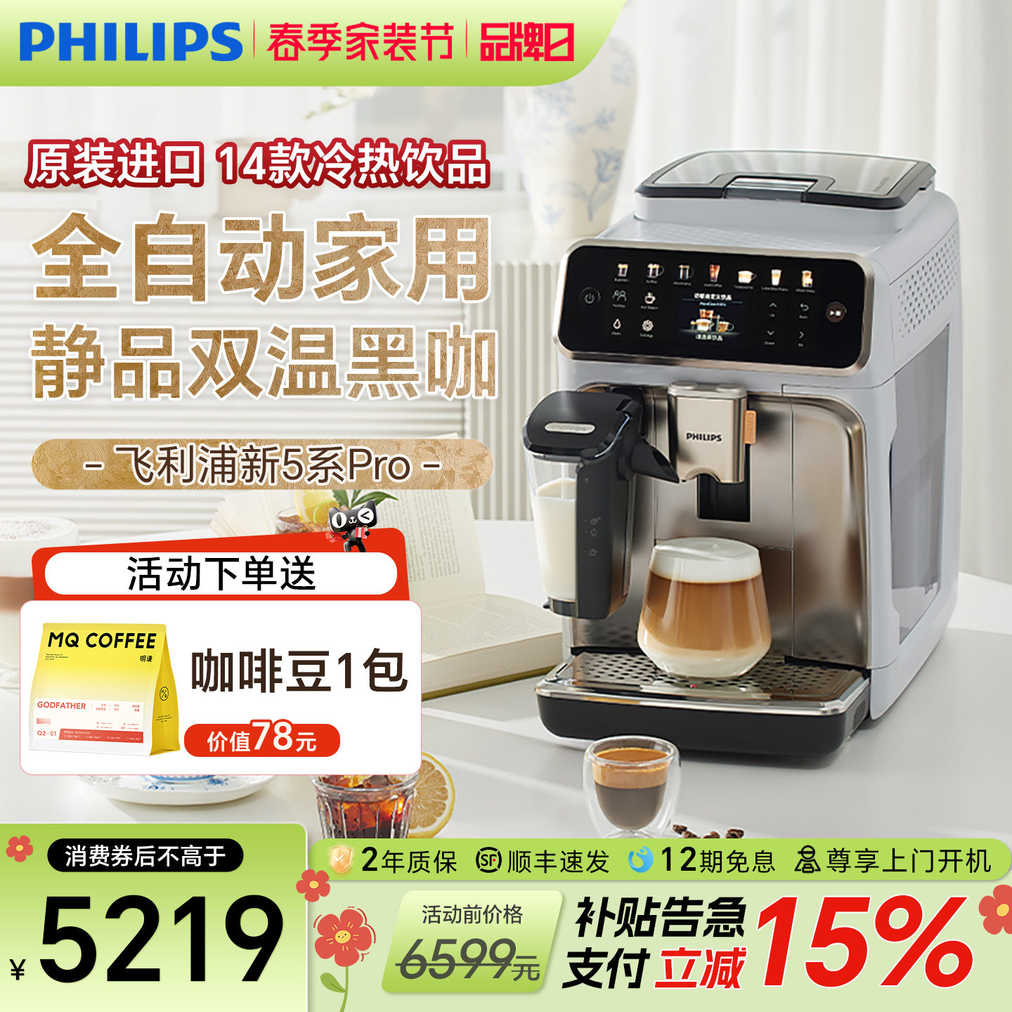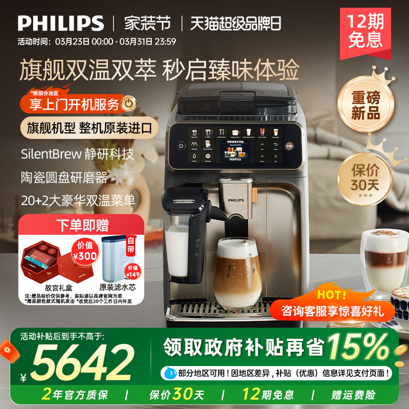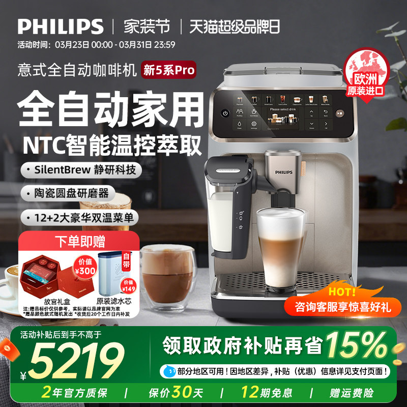 飞利浦咖啡机进口5系Pro全自动意式现磨家用办公研磨一体换新补贴