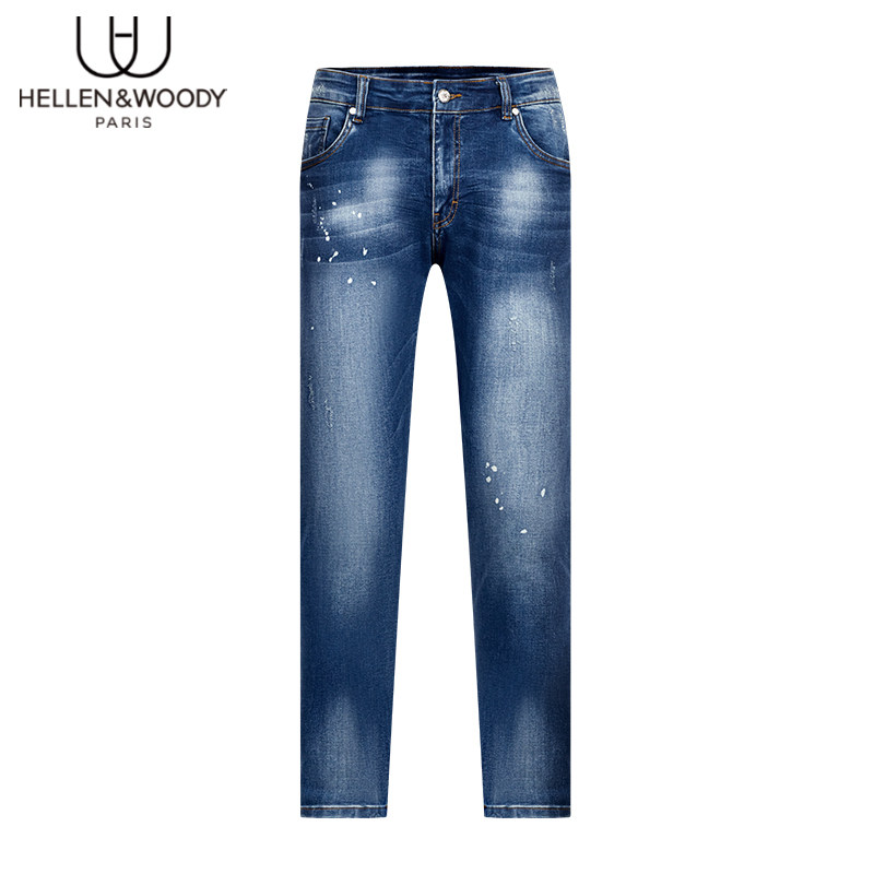 HELLEN&WOODY男装2026新款法国奢侈品水洗修身小脚弹力牛仔裤蓝色