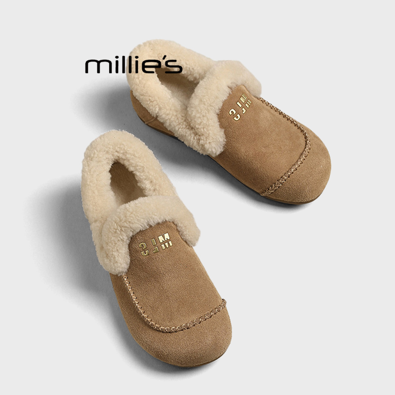 MILLIE'S/妙丽真皮豆豆棉鞋女秋冬新款外穿加绒保暖一脚蹬毛毛鞋Z