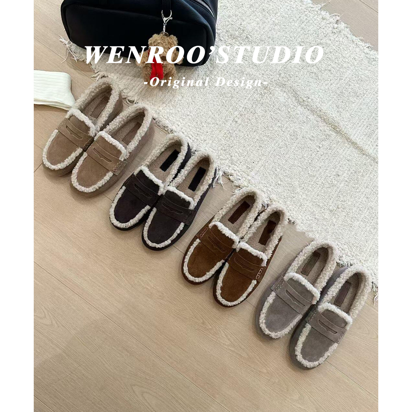 牛皮版!真皮加绒平底豆豆棉鞋女外穿25秋冬新款复古毛毛乐福单鞋