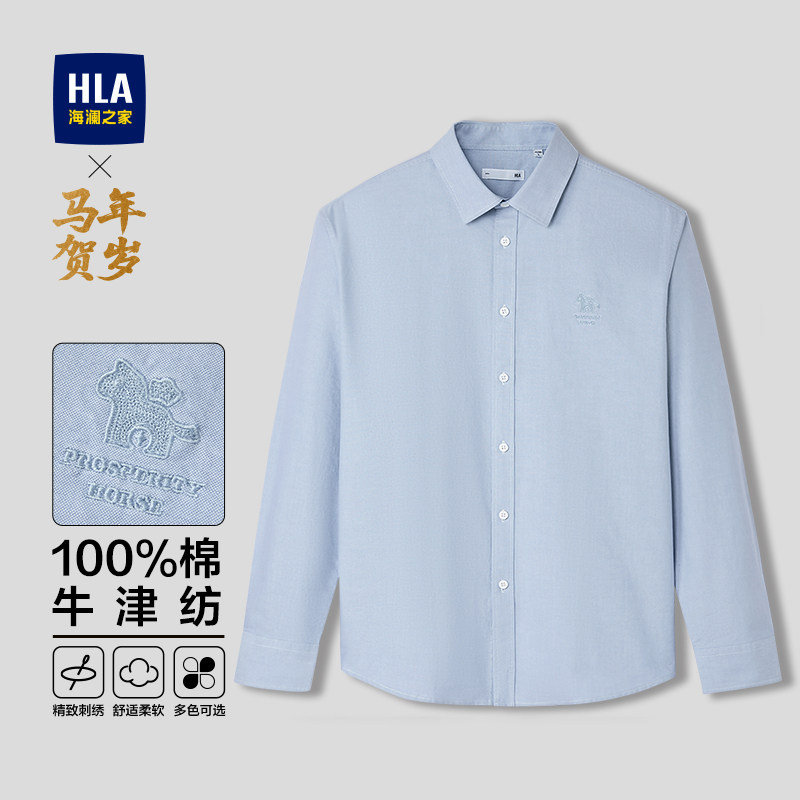 HLA/海澜之家马年贺岁纯棉牛津纺长袖休闲衬衫26春夏新刺绣衬衣男