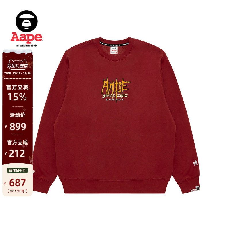 Aape旗舰男装秋冬猿人徽章字母发泡印花厚绒红色圆领卫衣B319XXN