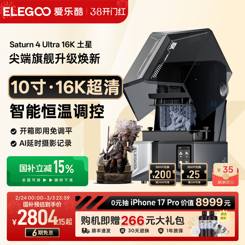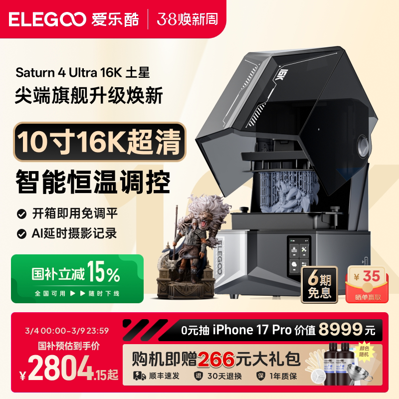 ELEGOO/爱乐酷Saturn 4 Ultra 16K土星S4U光固化3d打印机家用10寸桌面级高精度立体机器手办模型3d立体打印机