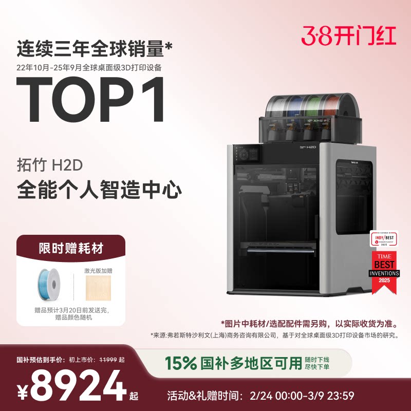拓竹H2D 3D打印机 激光雕刻模切画笔四合一 高精度大尺寸 家用多色 旗舰新品【大陆版】
