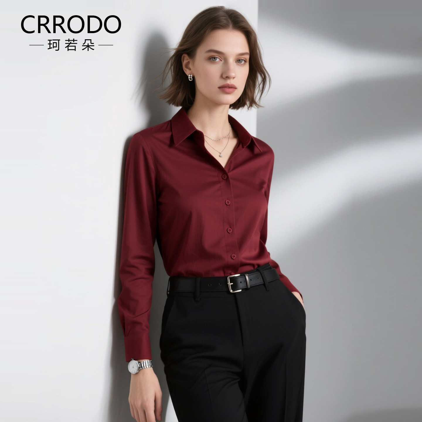 酒红色翻领长袖衬衫女2025秋季新款时尚气质棉质商务通勤职业衬衣
