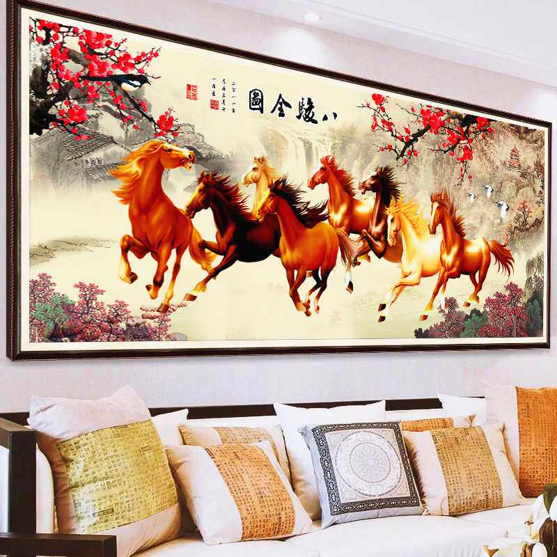 2023新款钻石画客厅家和万事兴山水风景画八骏图八匹马十字绣满钻