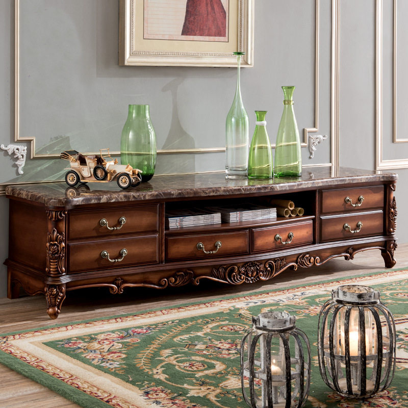 欧式天然大理石电视柜茶几组合 全实木雕花地柜仿古色客厅组合柜