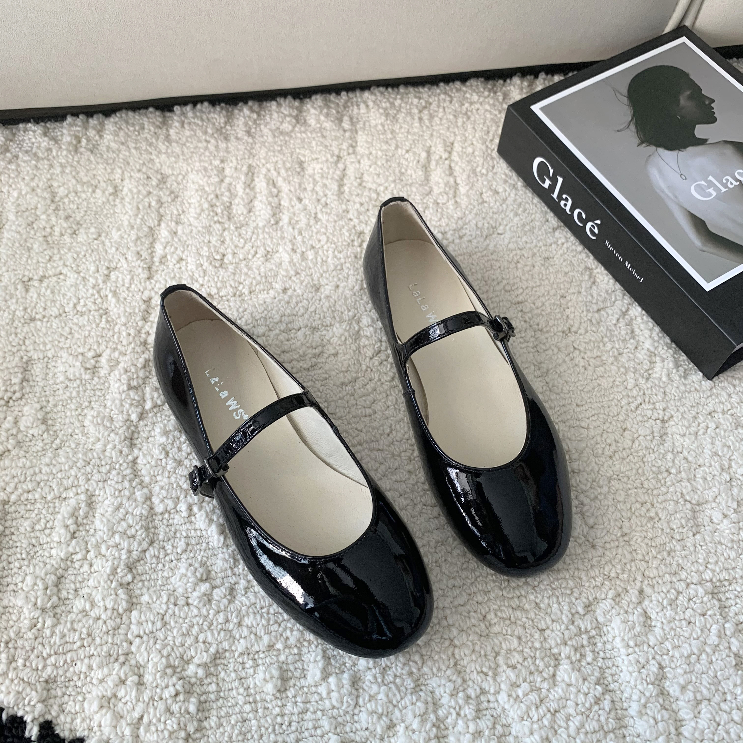 羊皮版~小香风玛丽珍鞋女法式复古平底浅口单鞋一字扣带粗跟漆皮