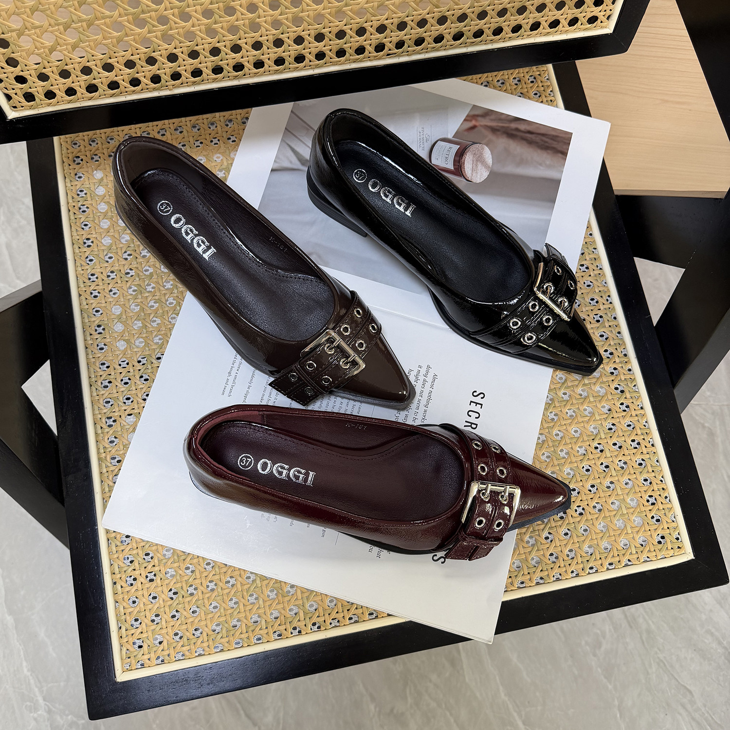 26春夏 外贸尖头漆皮女鞋金属扣装饰平底鞋通勤百搭酒红大码单鞋