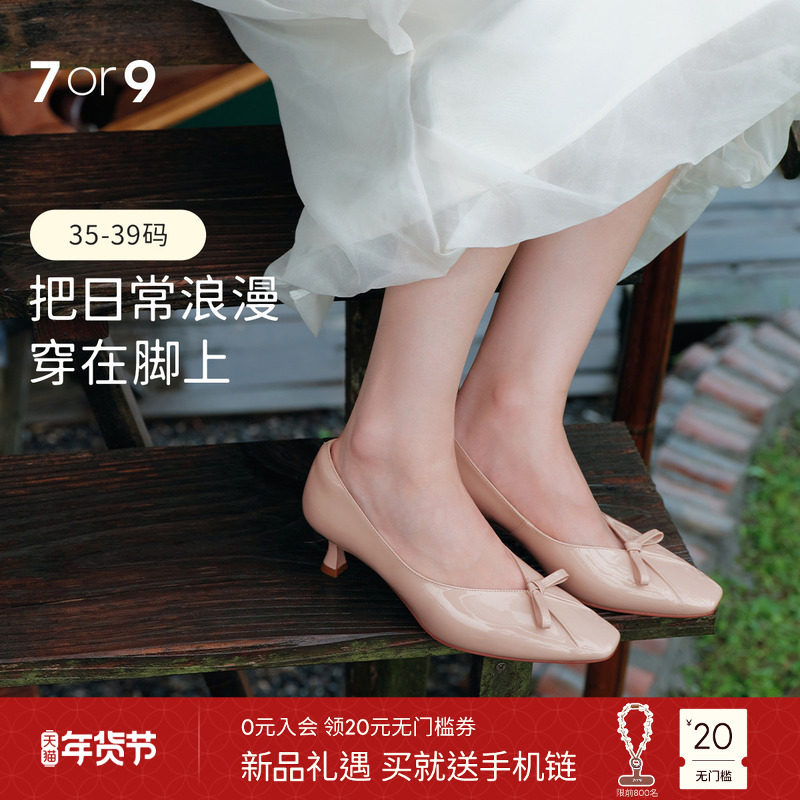 7or9甜美风蝴蝶结漆皮浅口单鞋女平底方头百搭女鞋桃红马卡龙