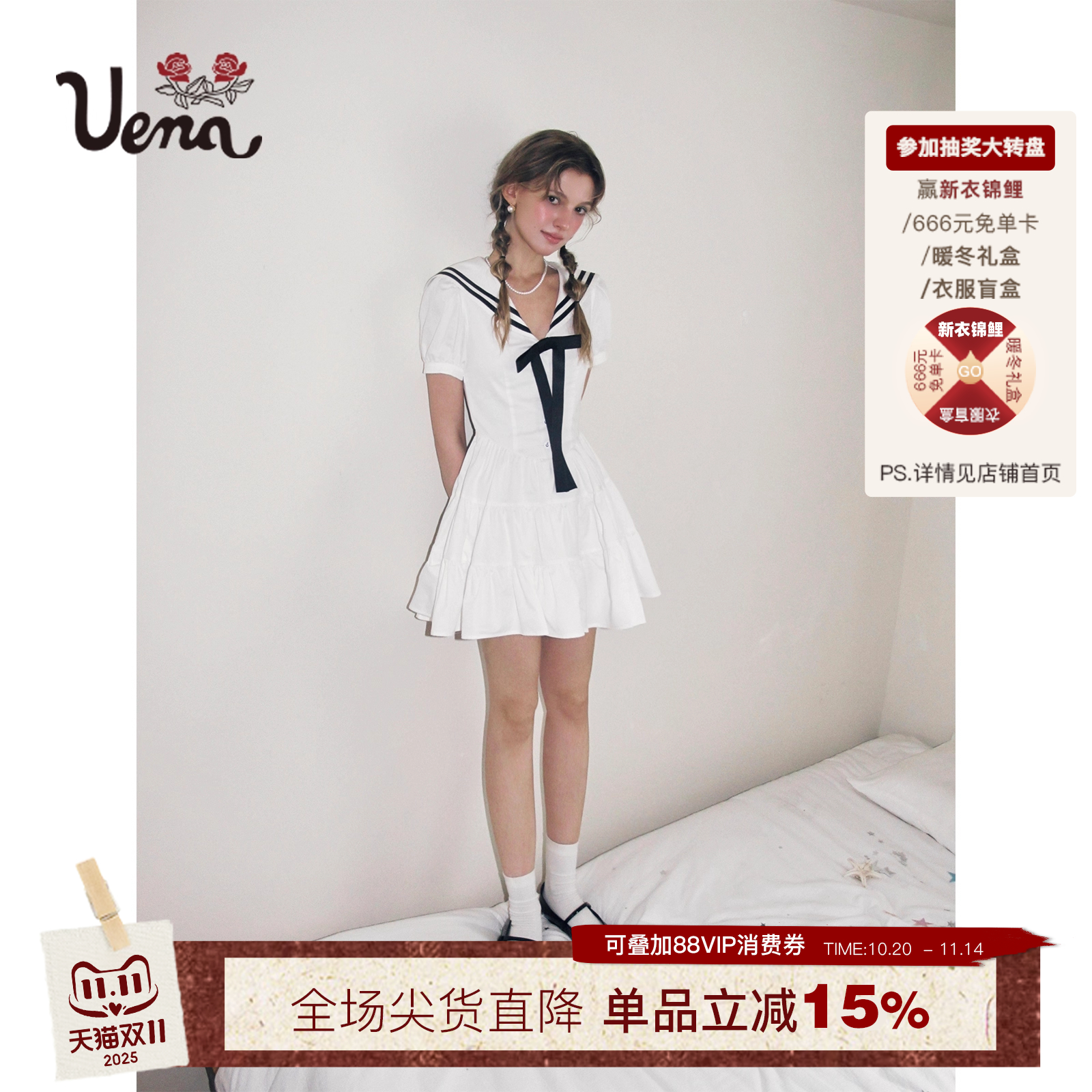【芝芝海盐】Uena白色海军风v领蝴蝶结A字收腰抽褶蛋糕下摆连衣裙