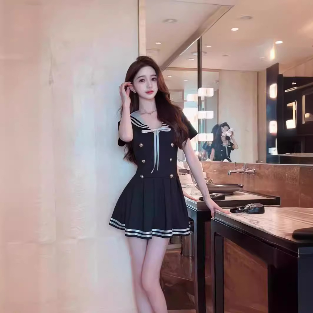 2025新款性感v领海军风连衣裙外贸收腰显瘦百褶裙蹦迪辣妹A字裙
