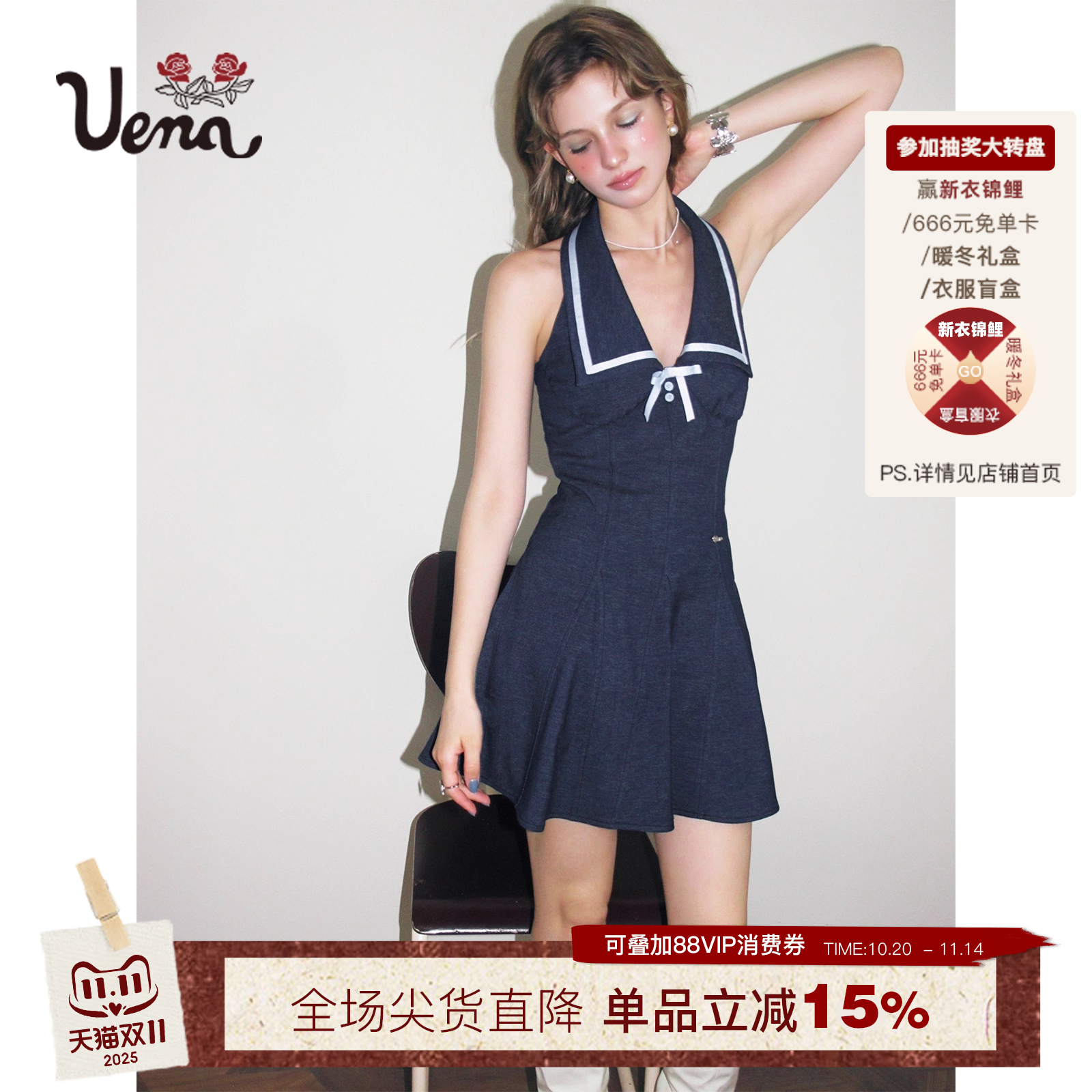 【海洋幻想曲】Uena美式复古海军风藏蓝色蝴蝶结v领A字挂脖连衣裙