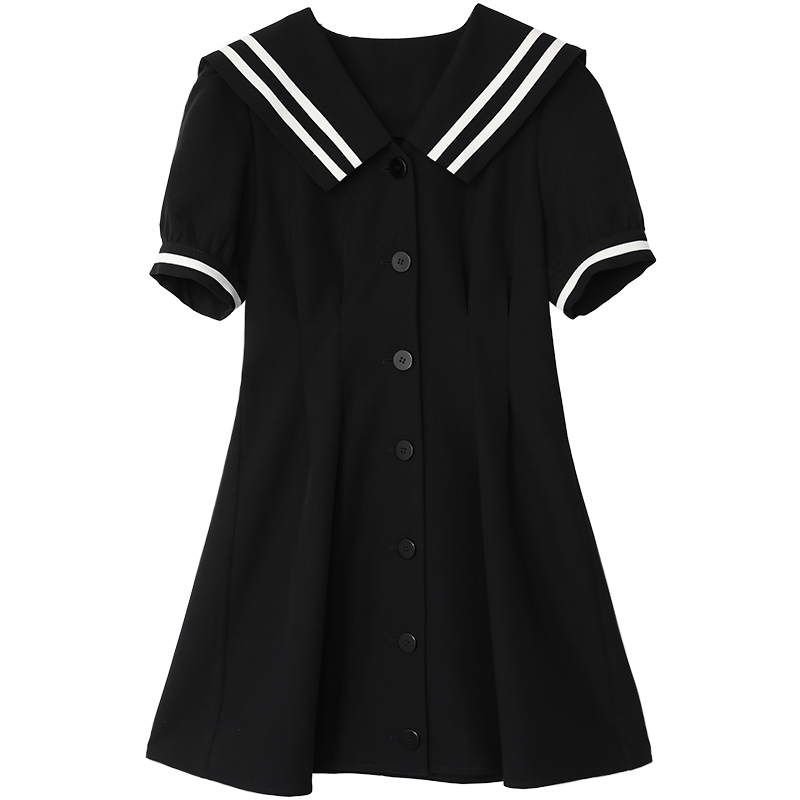 CHICVEN学院风v领海军领短袖连衣裙a字气质黑色收腰裙子2022夏季