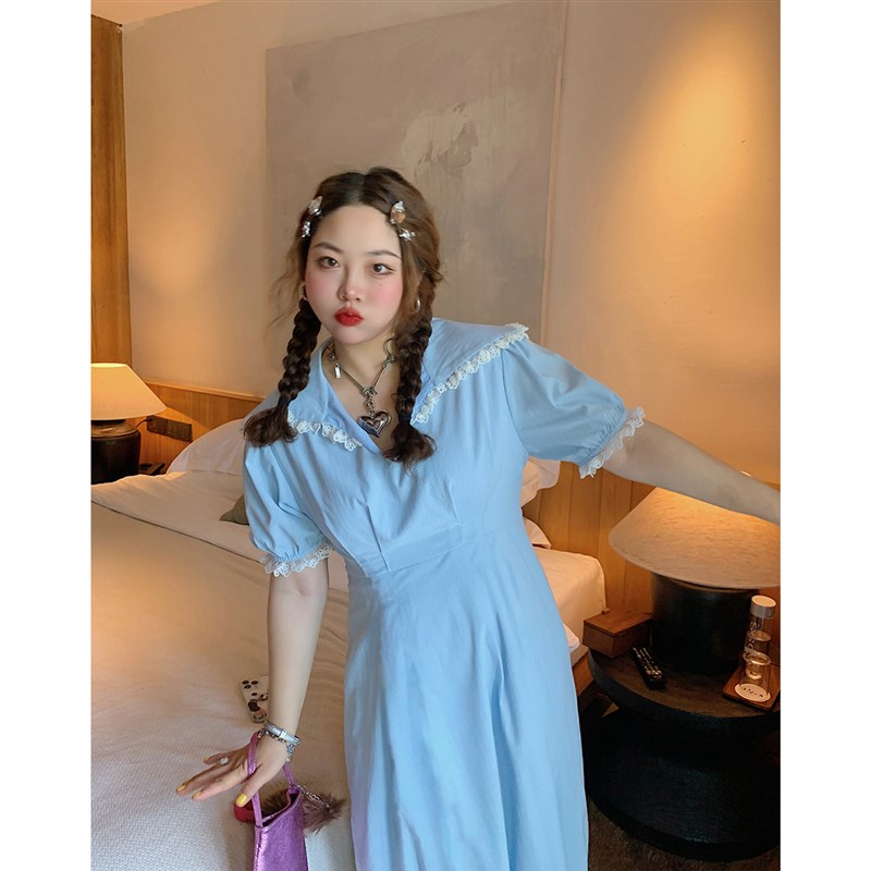日系复古学院风海军领连衣裙收腰显瘦V领法式初恋泡泡袖大码短裙