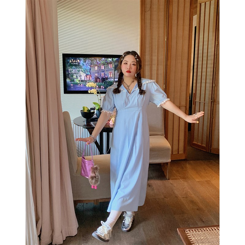 金大支海军风V领连衣裙夏日多巴胺大码女装胖mm遮肚显瘦蓝色裙子