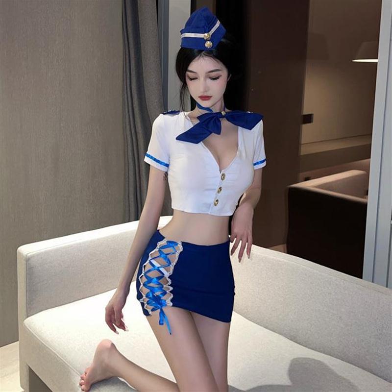 制服性感辣妹空姐深V领露肩包臀连衣裙cos海军风短裙子设计感小众