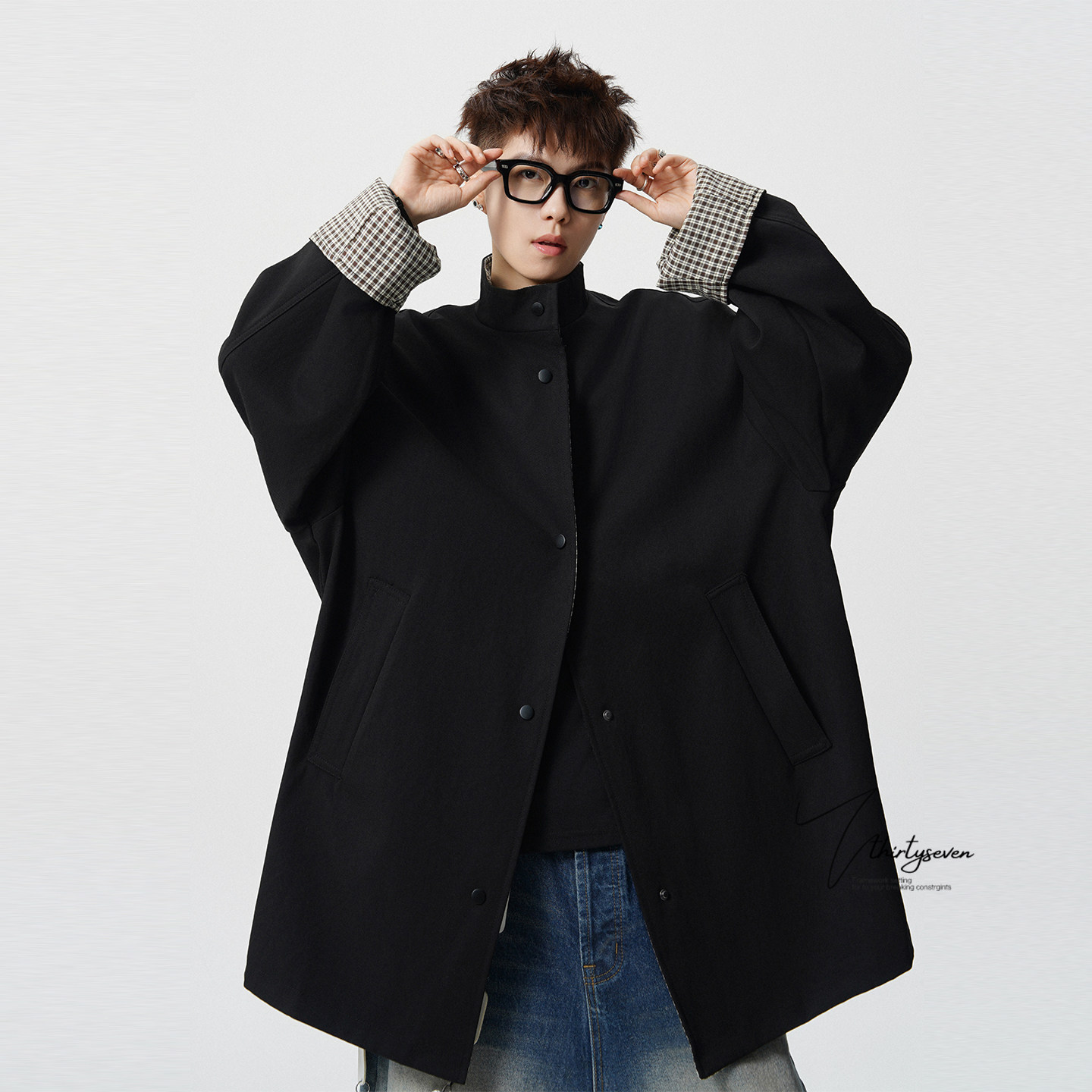 V37中性休闲风格子立领风衣男春季中长款宽松百搭拼接黑色外套潮
