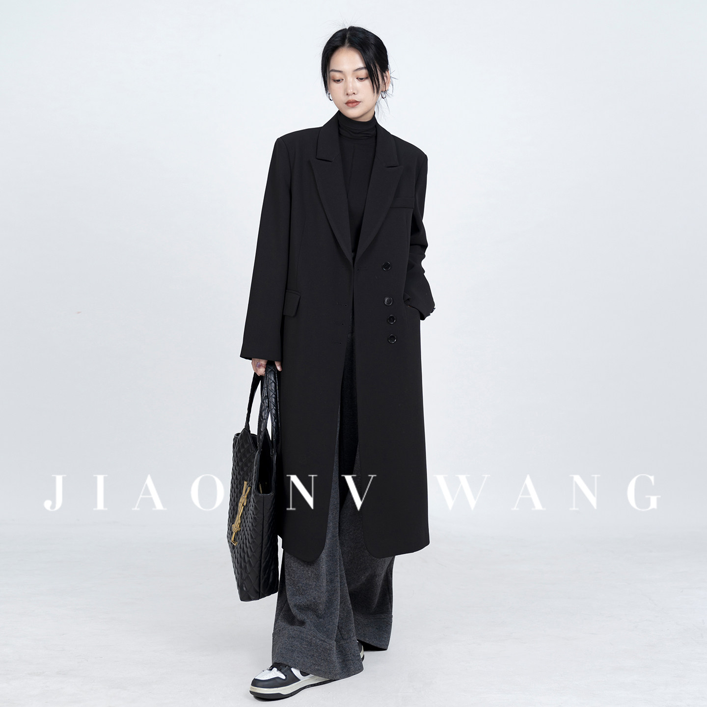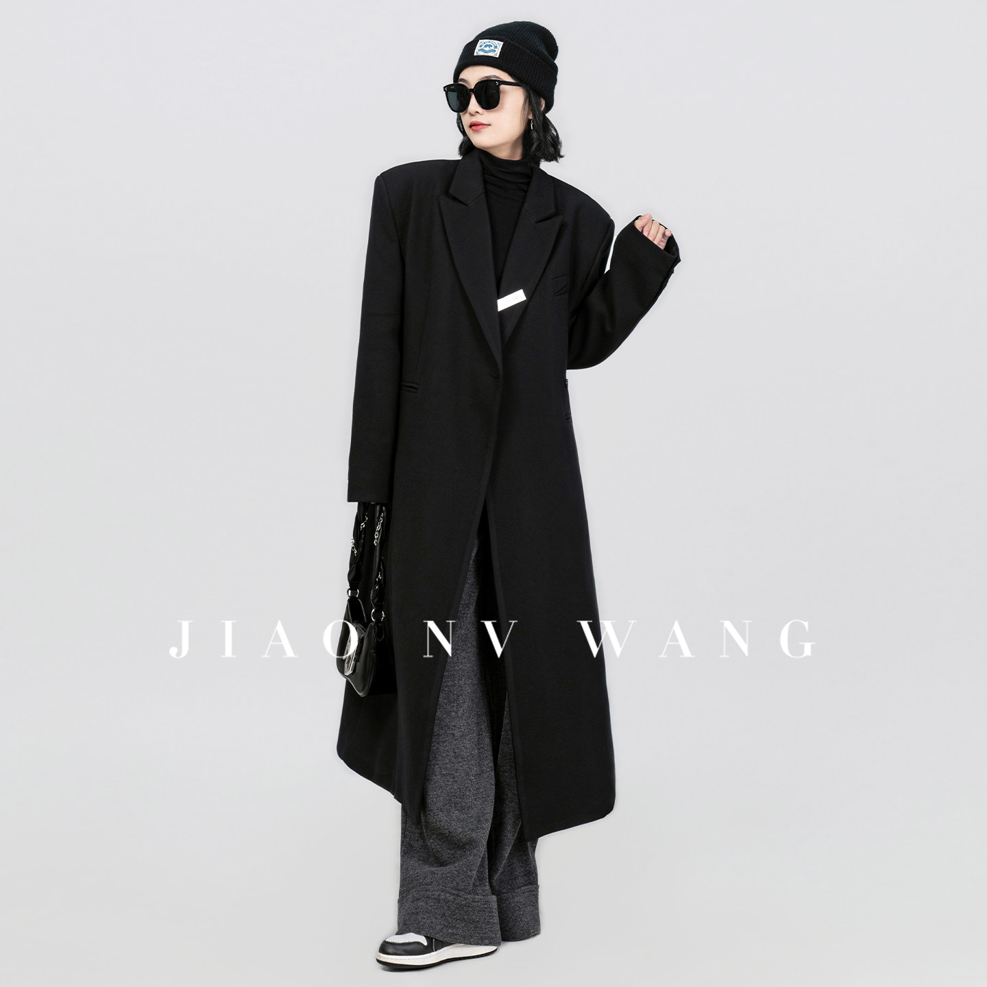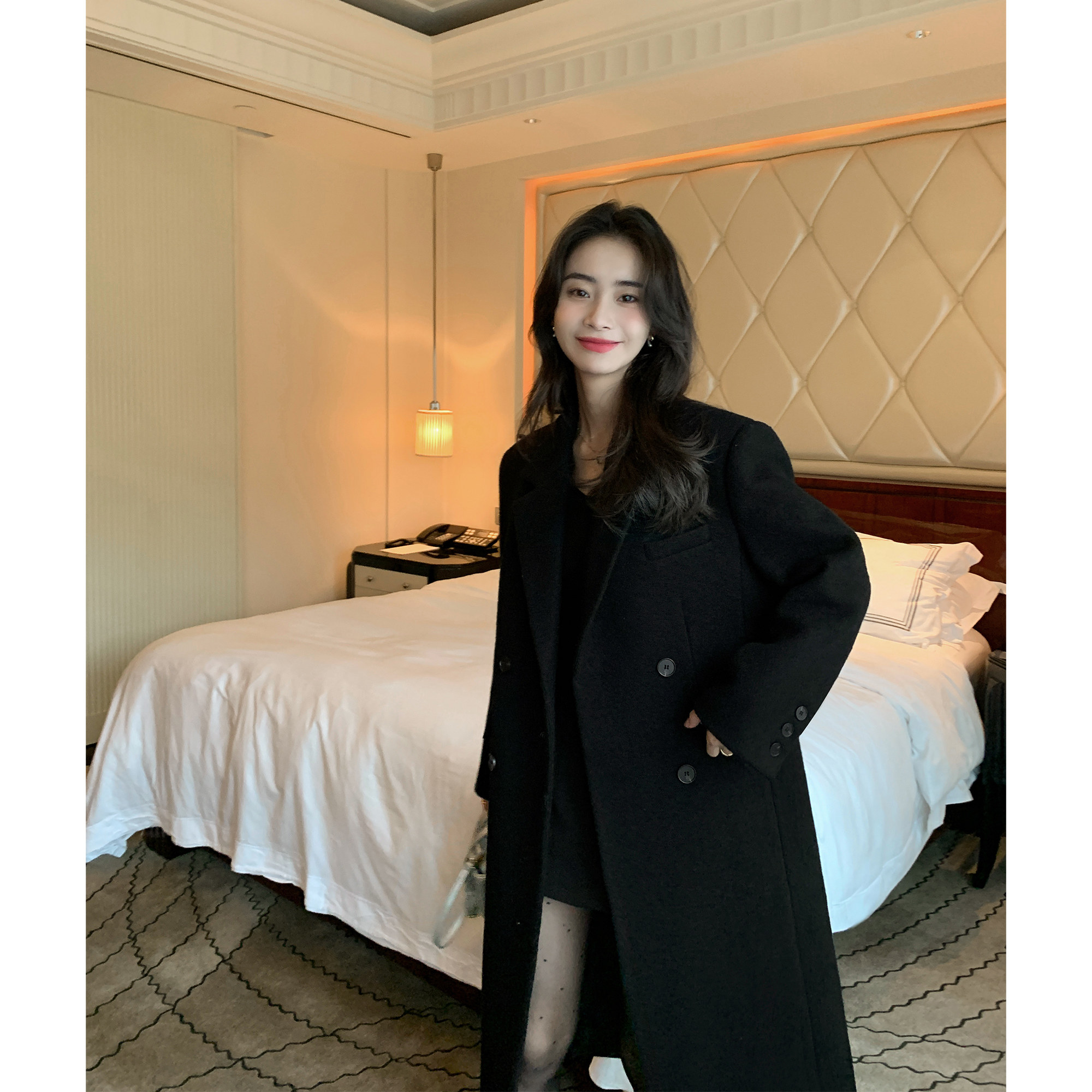 浅布调【黑钻石】冬新款宽松显瘦高个子加厚长款外套黑色毛呢大衣