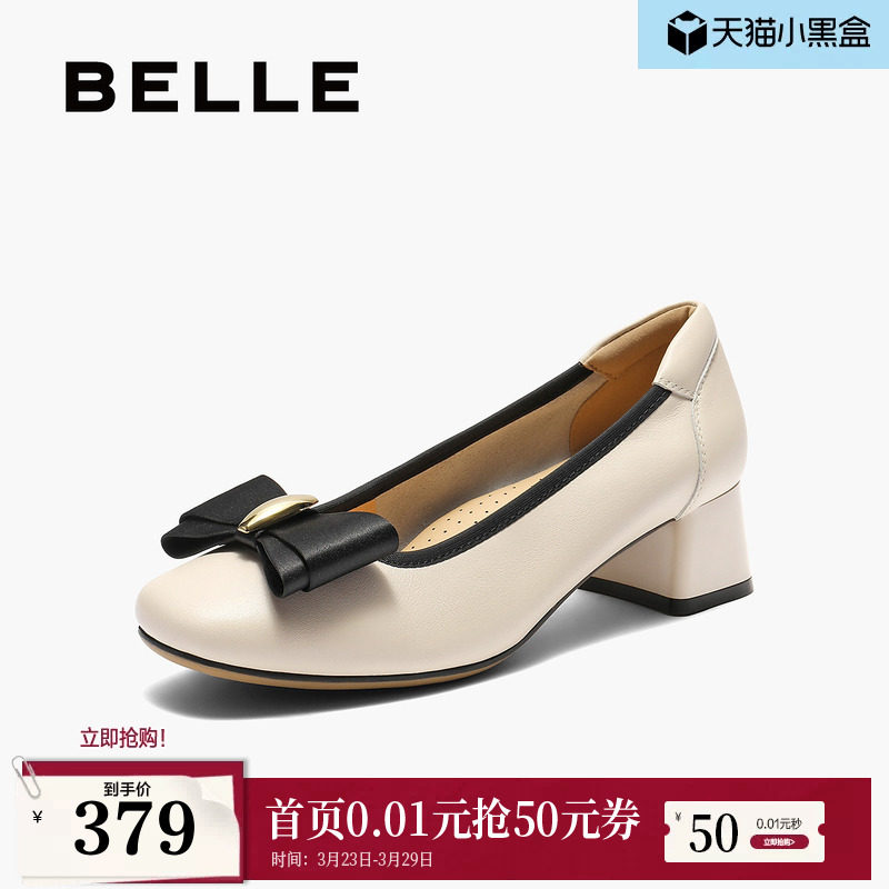 百丽女鞋子粗高跟鞋春季新款真皮不累脚妈妈浅口单鞋D8Q1DAQ5预