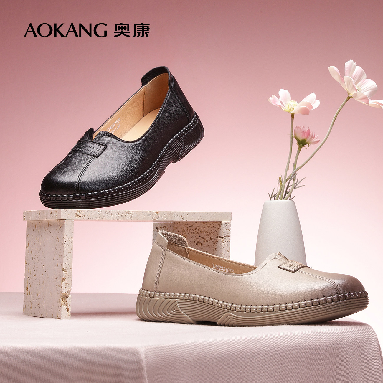 奥康舒适妈妈鞋子春季款浅口单鞋中老年软底真皮皮鞋防滑平底女鞋