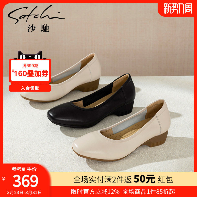 沙驰女鞋时尚粗跟妈妈工作鞋女2026年春夏新款真皮浅口职业单鞋子