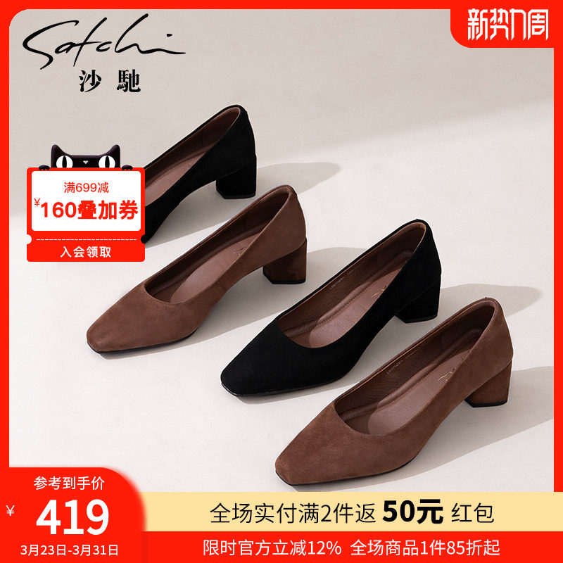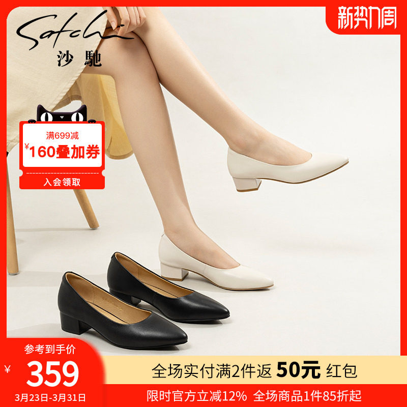沙驰女鞋优雅羊皮浅口单鞋女2026年春夏新款粗跟职业通勤鞋妈妈鞋