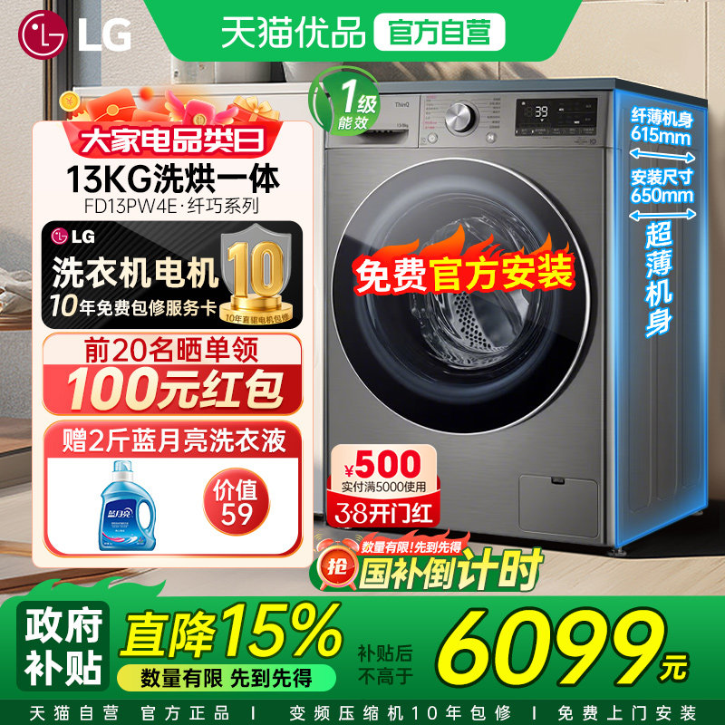 LG洗烘脱一体机8/13KG大容量全自动滚筒洗衣机烘干机FD13PW4家用Y