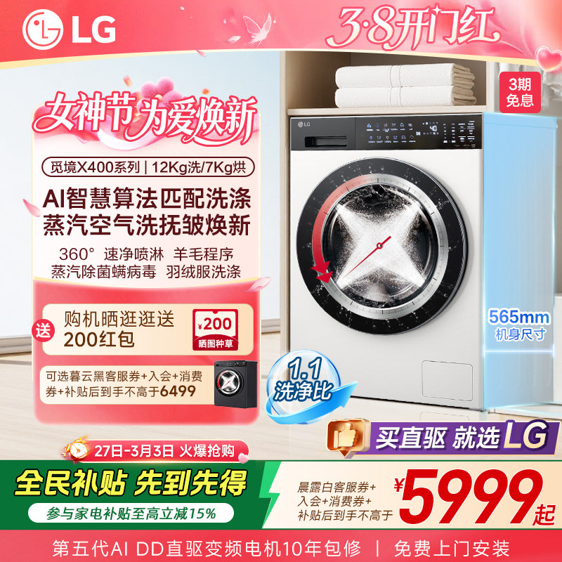 【觅境X400】LG洗烘一体机12Kg智能洗衣机烘干全自动FD12DK2E