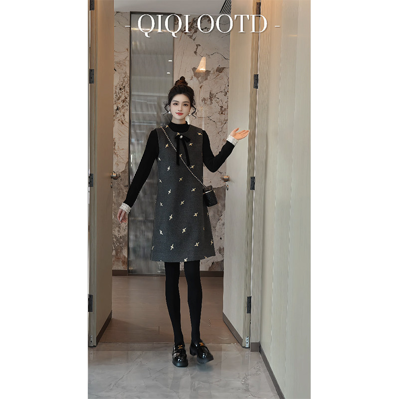 柒院家大码气质小香风刺绣背心连衣裙2025秋冬宽松显瘦叠穿中长裙